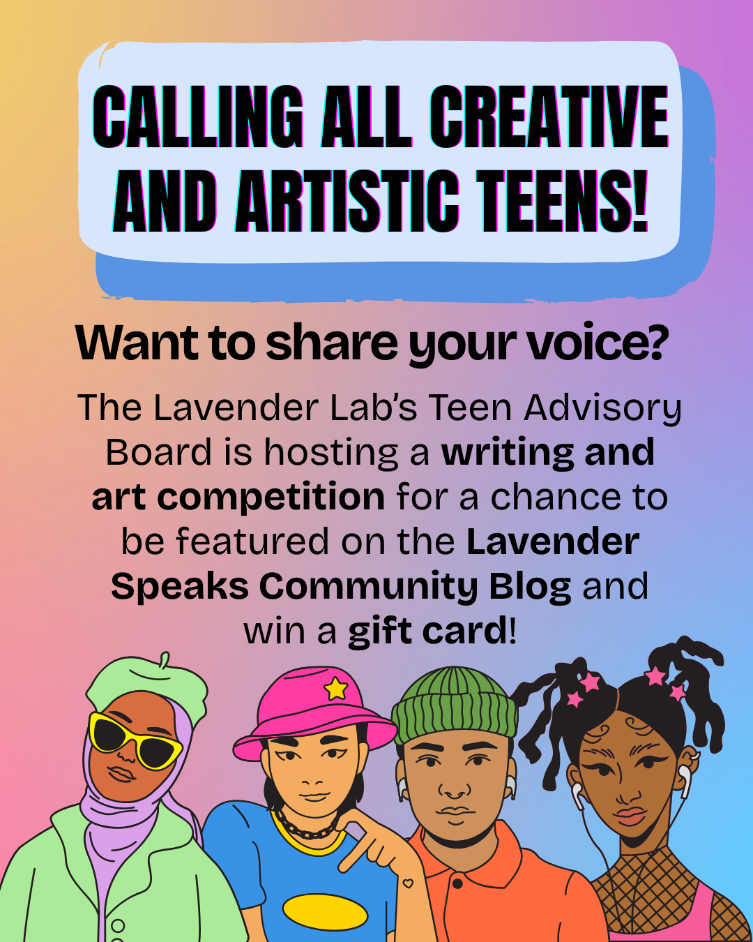 The Lavender Lab’s Teen Advisory Board is hosting a writing competition for a chance to be featured on the Lavender Speaks Community Blog and win a gift card!